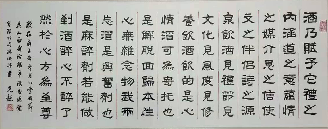 汾陽市清香酒業有限公司座落在中華名酒第一村---杏花村申明亭路9號?!斗诰魄分杏涊d,申明亭畔新淘井,水重依稀亞蟹黃 ,注解說:申明亭井水絕佳,以之釀酒,斤兩獨重。明末愛國詩人、書法家和醫學家傅山先生,曾為申明亭古井親筆題寫了得造花香四個大字,說明杏花井泉得天獨厚,釀出的美酒如同花香沁人心脾。 汾陽市清香酒業有限公司出品的清香型高端白酒用的是優質高粱、大麥和豌豆等上等原料和申明亭地下礦泉水,再加上杏花村土壤和空氣中獨有的菌群,在杏花村釀酒匠人的傳統工藝下精心釀造:清蒸二次清,固態地缸分離發酵,清字當頭,一清到底,釀出的酒:酒液晶亮、清香幽雅、醇凈柔和、回甜爽口、飲后余香,在國內外享有盛譽。